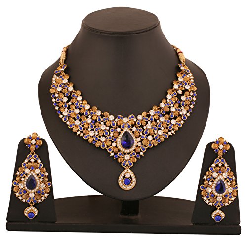 Alloy metal, very intricate and charming, traditional Indian classical floral theme bridal necklace set with white Rhinestones and faux blue sapphire in antique gold tone, For Perfect Matching, search for TOUCHSTONE BANGLES.