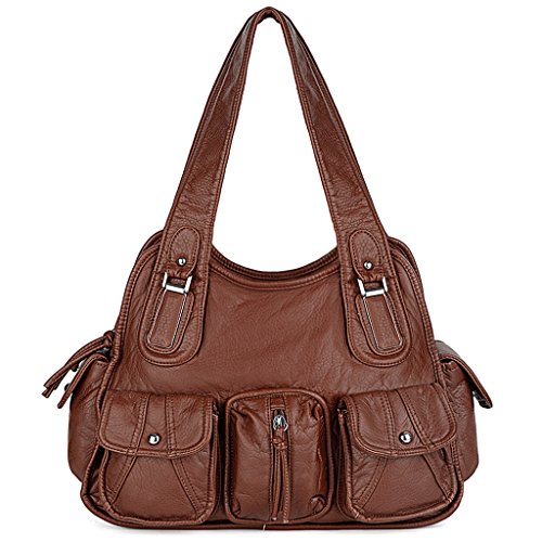 -. Brand : UTO -. Department : womens -. Feature : Ultra soft synthetic vegan leather with fabric lining. / Modern rhodium silver color hardware. Top zipper closure. / Exterior features multi pockets: 2 front magnetic buckle slip pockets and 2 zipper pockets, 1 back zipper pocket and 2 side magnetic buckle pockets. Interior has large compartments with double top zipper closure: Contains 2 open pockets and 1 internal zipper pocket. / Comfortably holds 12.9" iPad Pro / 10.1" Fire HD, tablet or a laptop 12" and under. / Size: 13.77"L x 4.17"W x 9.44"H. Weights: 1.46 pounds. Shoulder straps drops 12.59", which is deep enough to wear on your shoulder comfortably. Lightweight and roomy for everyday use. -. ProductGroup : Shoes -. ProductTypeName : HANDBAG -. Title : UTO Women Handbag PU Leather Front Zippers Washed Shoulder Bag