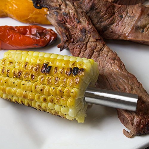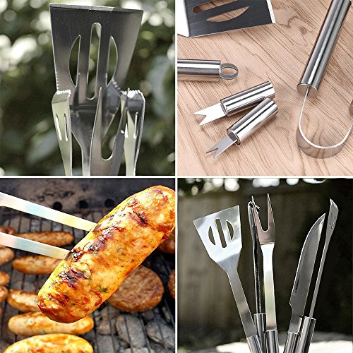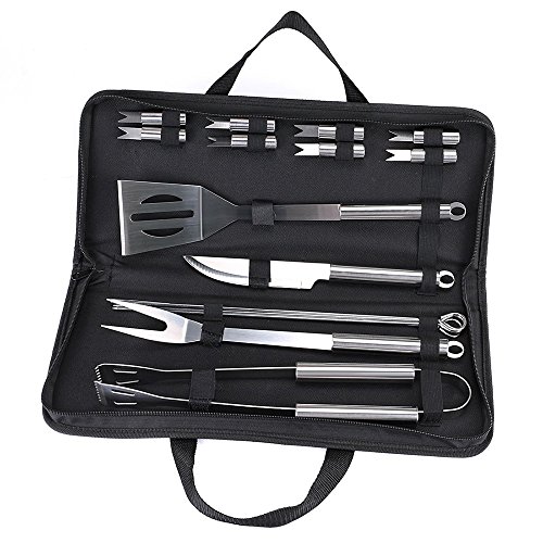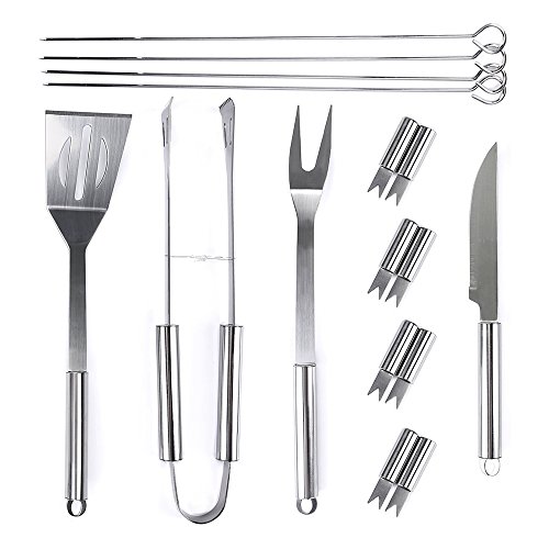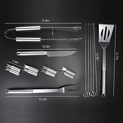 THE BEST BBQ ACCESSORIES: Professional-Grade 16-piece (includes a tongs, knife, meat fork, spatula, 4 skewers and 8 corn holders) practical barbeque tool set in a high-quality carry canvas bag with zipper for secure storage, it's the finest heavy duty BBQ grilling utensil sets.