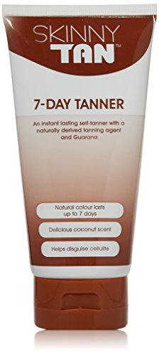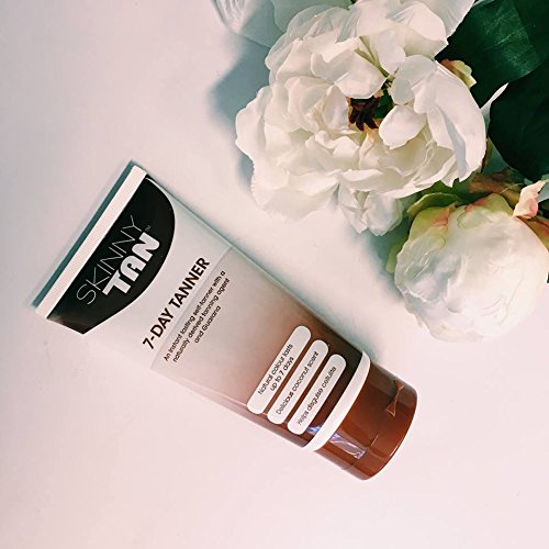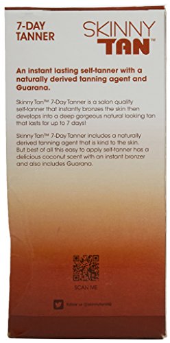 Our most popular 7-day tanner combines a natural tanning active with naturally derived skin smoothing and firming agents. The natural active reacts with the aminos in your skin to create a natural lasting tan that literally cannot streak. Skinny tan 7-day tanner goes on instantly bronze then develops into a perfect streak-free medium tan that is gentle on the skin and lasts for up to 7 days. No drying or flaking, Skinny Tan 7-day tanner fades naturally over 7-days with your skin's natural cell turnover. Can be reapplied for a darker effect. Delicious scent. (4-6 full body applications per tube). Independently clinically studied and verified as the best self-tanner,