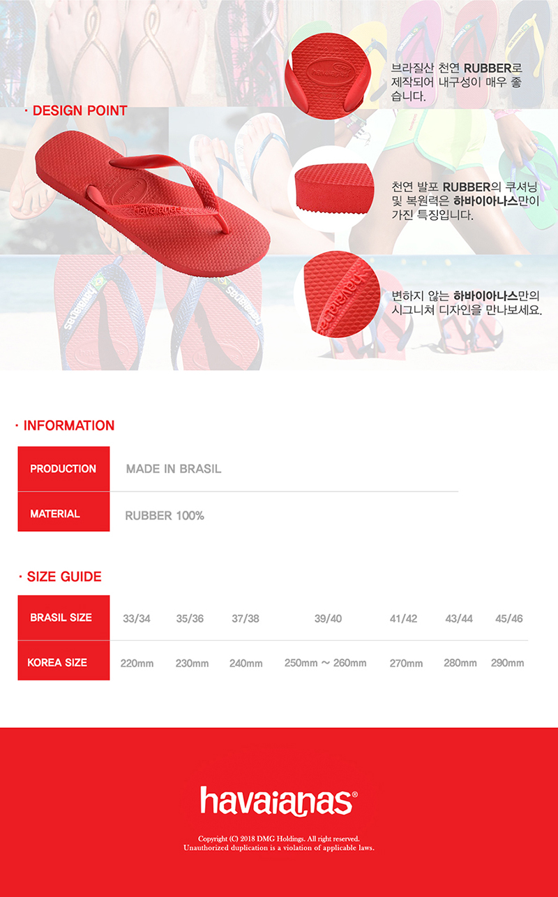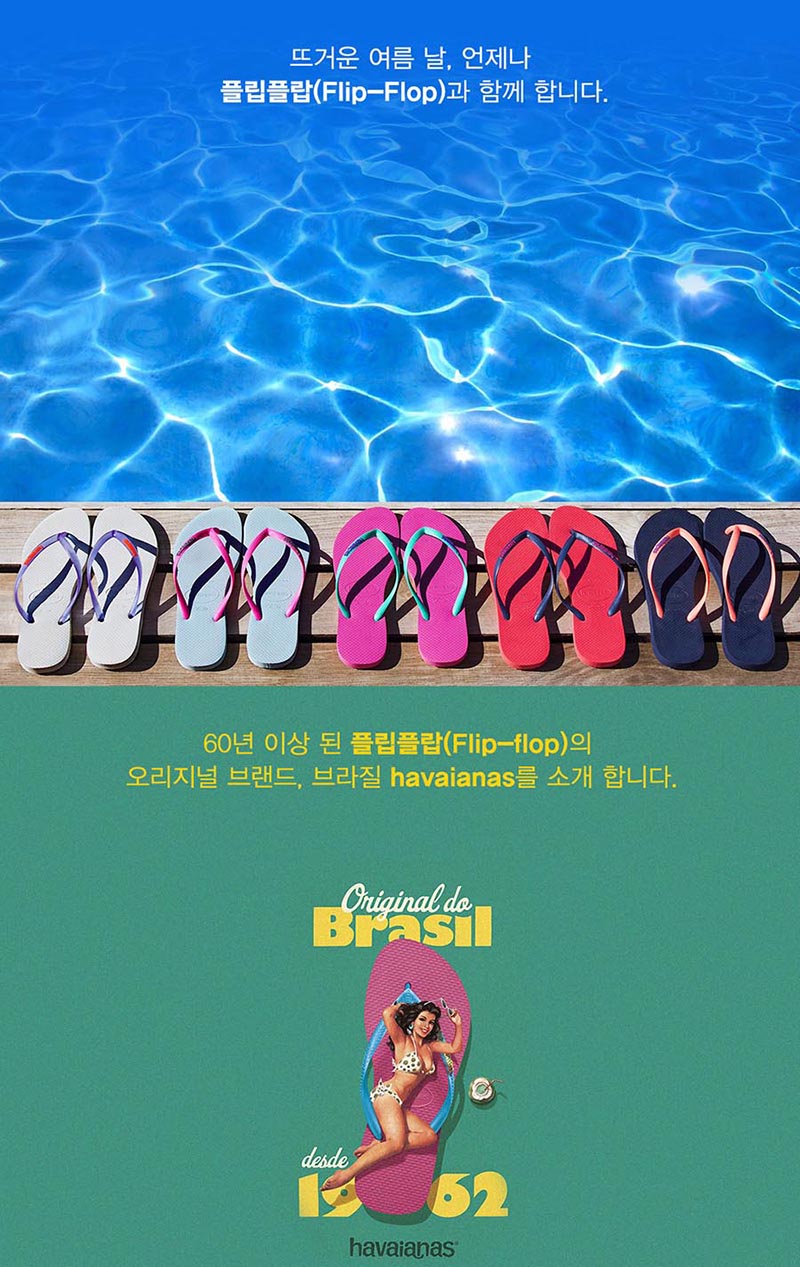 (하바이아나스)는 1962년 직물 스트랩과 볏집바닥으로 된 일본의 ZORI에서 영감을 받아 브라질에서 탄생 되었습니다. 트레이드 마크인 바닥 텍스쳐의 모양은 쌀 모양에서 영감을 받아 제작이 되었습니다.