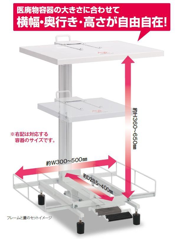 | 医廃物容器の大きさに合わせて横幅・奥行き・高さが自由自在!!様々な大きさに対応できる便利な可変式の医廃物容器ホルダーです。 |
