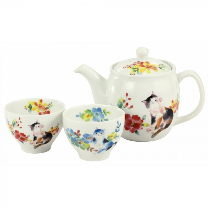 | 水彩画のようなタッチで花と猫を描いたペアの煎茶碗とポットのセットです。大切な方へのギフトにも最適です。 |