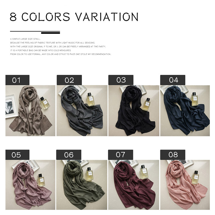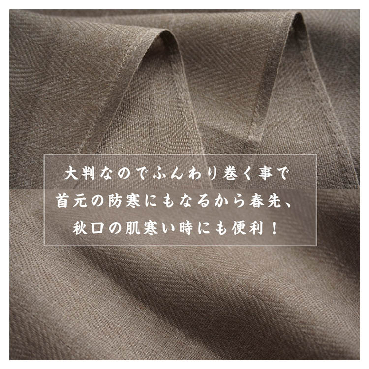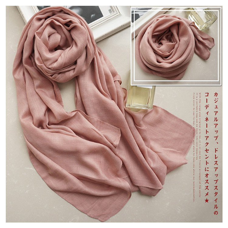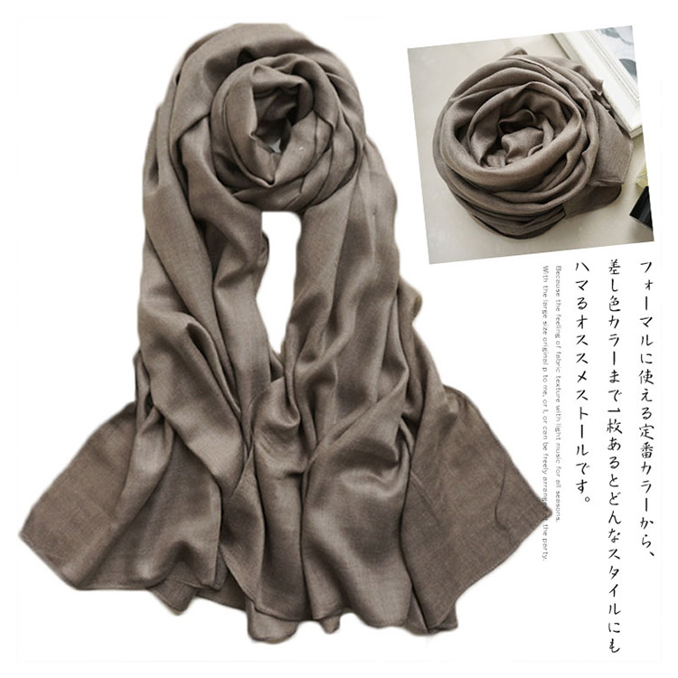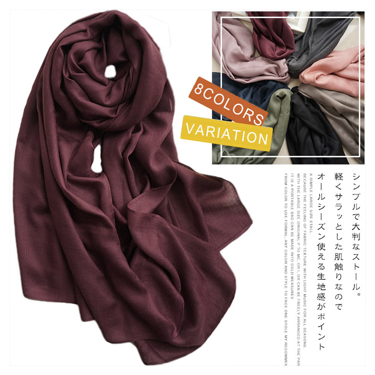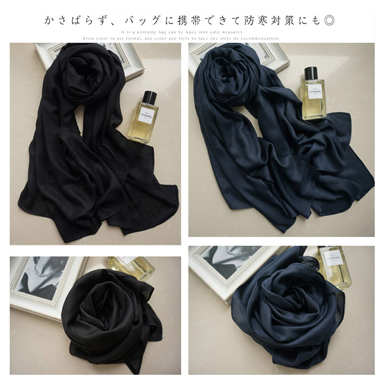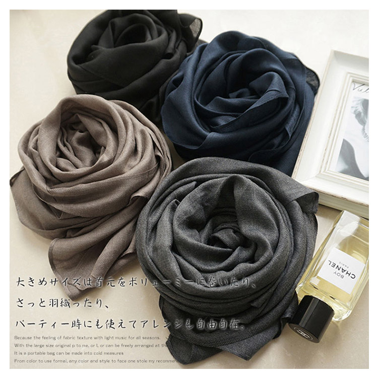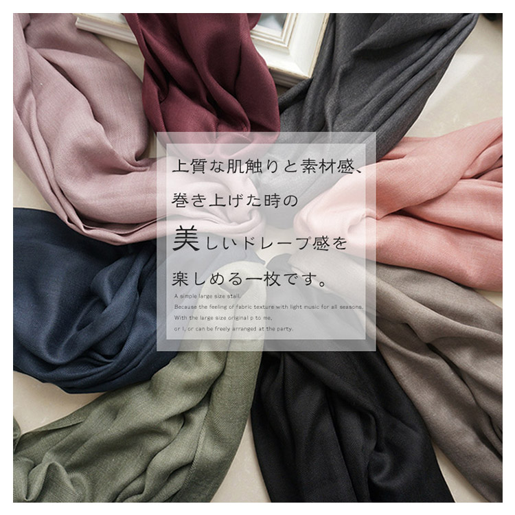 | シンプルで大判なストール。軽くサラッとした肌触りなのでオールシーズン使える生地感がポイント。大きめサイズは首元をボリューミーに巻いたり、さっと羽織ったり、パーティー時にも使えてアレンジも自由自在。かさばらず、バッグに携帯できて防寒対策にも◎フォーマルに使える定番カラーから、差し色カラーまで1枚あるとどんなスタイルにもハマるオススメストールです。 | |