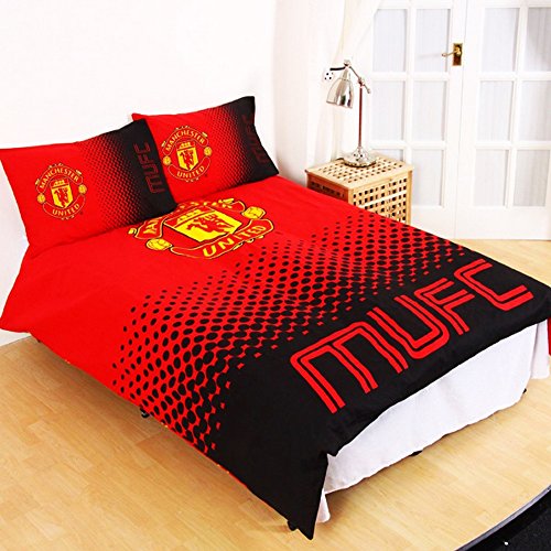 Product Description Double duvet set with reversible official Manchester United FC design. Size approx: Pillowcase- 20in x 30in, Duvet Cover- 79in x 79in. 52% Polyester, 48% Cotton. Machine washable. The Manchester United FC duvet set is an officially licensed product. Please note: This product is a UK import, this duvet cover supplied is slightly smaller than the standard US duvet size, it will fit but the duvet may fold at the edge when covered. This is not a comforter but a cover for a duvet. 0
