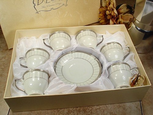 Product Description Serve Espresso coffee in style with this classic designer 12 piece Espresso Gift Set for six. Fine porcelain design displayed in a beautiful rose print embossed satin lined display box. Each delicately shaped Espresso cup features a most classic decor. Each cup and saucer is made of fine white porcelain. Cups are dishwasher safe and FDA approved. Perfect for elegant restaurant cups or for the home. Each cup measures 2.5 inches deep x 2.2 inches tall. A perfect match to Old Chicago Coffee's Brazilian Blackened Roast for Espresso (search for B00H3WCP7O to view). 0