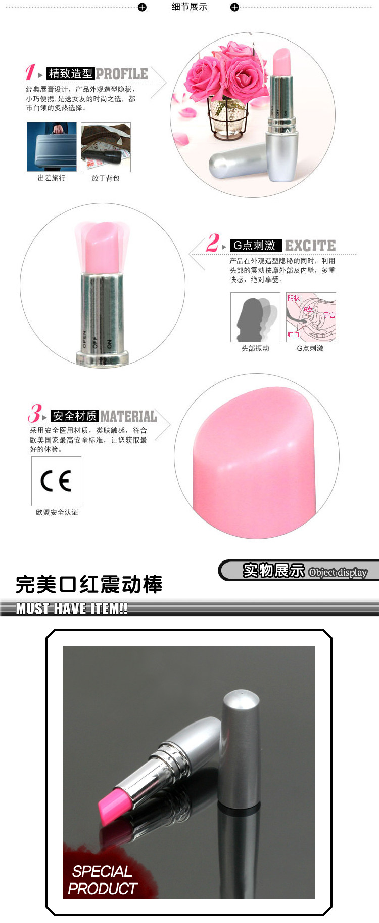 口红外型设计震动强度可随意调节,使用者可自行对阴蒂部位进行震动,起到刺激局部神经、促进血液循环、调节内分泌的作用,增进性反应过程,达到理疗 、健慰、增加情趣和提高性生活质量的目的。适用于女性自慰。用于女性面部、前额、颈部震动按摩,可促进局部血液循环,起到舒缓皱纹之美容目的。