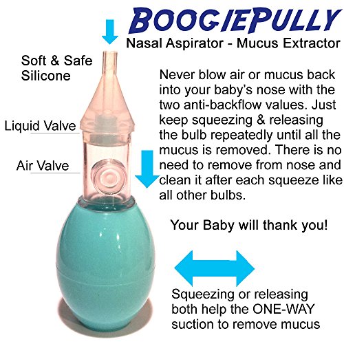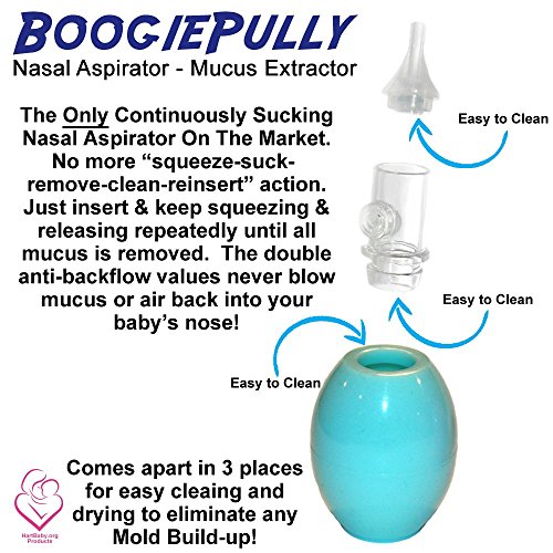 -. Title : Help Your Baby Breathe And Sleep Better. BoogiePully Baby Nasal Aspirator. No Mold Build-up Anti-Back Flow Valve System Never Blows Mucus Back Into Your Baby's Nose With Continuous Squeezing. Suck Mucus, Not Just Air.