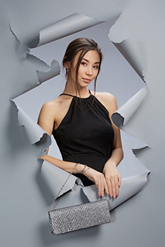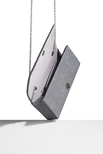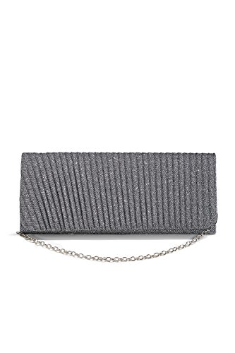 Glittering clutch purse with a pleated front flap, a magnetic clasp, a removable chain strap. Fully lined satin interior has a pocket for credit cards. Perfect addition to your evening, formal, prom or cocktail outfit.