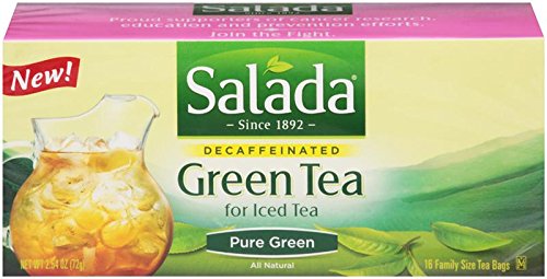 -. Binding : Grocery -. Brand : Salada -. Color : Green -. Feature : Natural, simple ingredients. / With one quick glance, you'll see our tea contains zero calories and one ingredient. / Nature made green tea is simple and delicious, so it only makes sense to keep it that way. / Decaffeinated pure green. / Brew the perfect pitcher of iced tea, and enjoy with family and friends. -. Label : Salada -. Manufacturer : Salada -. PackageQuantity : 1 -. ProductGroup : Grocery -. ProductTypeName : GROCERY -. Publisher : Salada -. Studio : Salada -. Title : Salada Green Tea - Decaffeinated