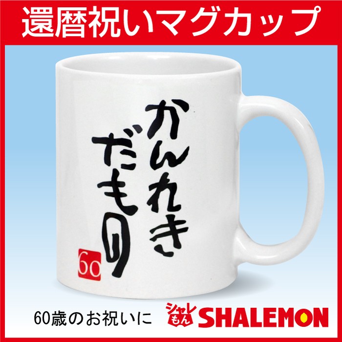 「かんれきだもの」デザインが最高!シャレもんオリジナル還暦祝い用【マグカップ】一般的なサイズのマグカップです。サイズ:直径8cm・高さ9.5cm当店の還暦のtシャツやパンツに添えて贈るのがおすすめ!実用的な還暦祝いで、ずっと大切に使ってくれるはず!コーヒーや紅茶など、くつろぎのスキな方への還暦祝いにどうぞ。他にも還暦商品が数十種ありますので、当店シャレもんの還暦コーナーをご覧ください。きっと、笑顔になる還暦祝いはシャレもん!!
