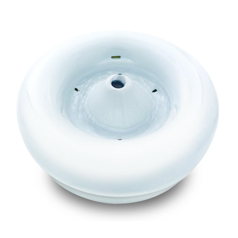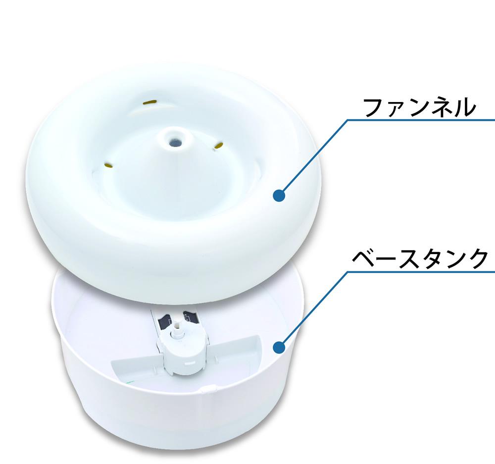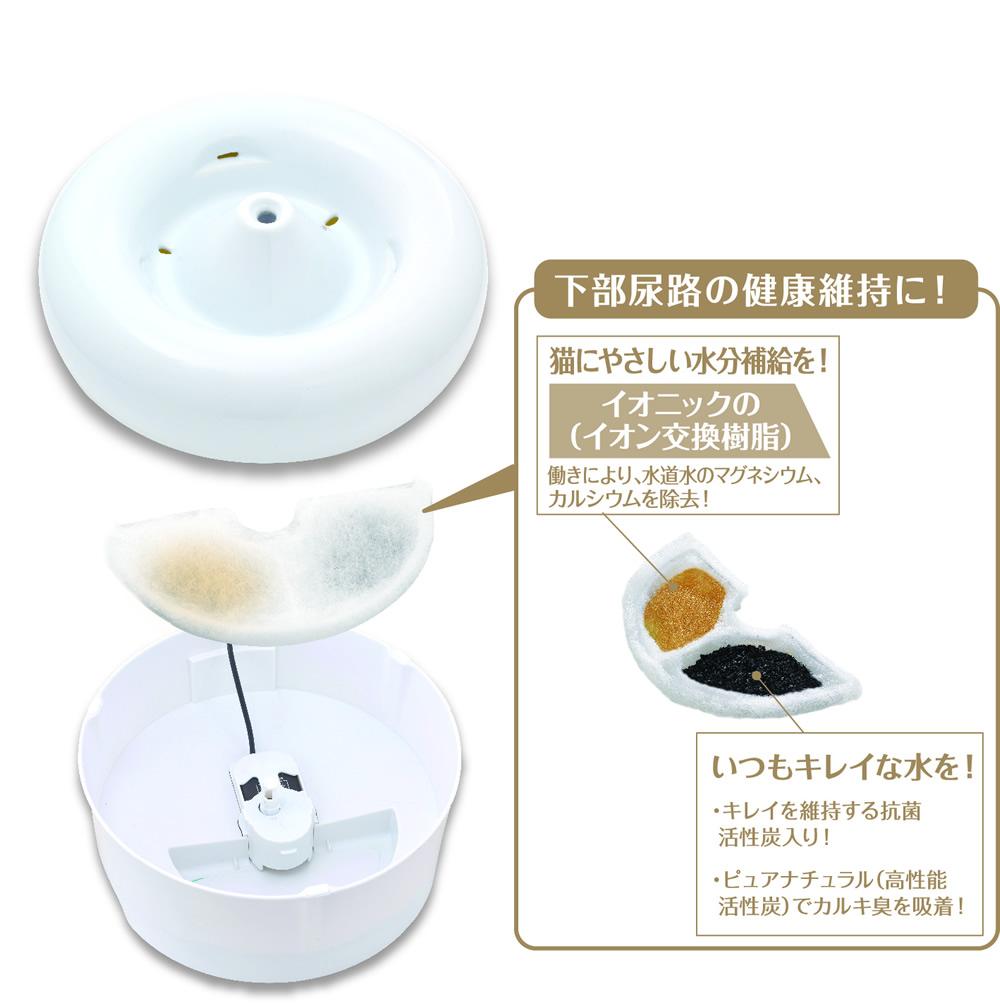 ワンランク上の「キレイ」な水を! ピュアクリスタルCERAMICS -セラミックス-は陶器製の飲み口なので、金属やプラスチックのアレルギーがあるネコちゃんでも安心してご使用いただけます。中心部から穏やかに溢れた水流で、食べカスや被毛等を飲み口から下部タンクへ流すので、飲み口は常にキレイな状態を保て、飲みやすさを追求したセラミック製循環式給水器。飲み口が広く、外観からはフィルターやコード・ポンプなどの内部構造が見えないスタイリッシュなデザインです。毎日の水換えやお手入れが必要なベースタンク部分は使いやすさを重視した、軽くて持ち運びのしやすいABS樹脂製です。専用カートリッジでフードカスやホコリ、抜け毛をキャッチし、キレイを維持する抗菌活性炭とピュアナチュラル(高性能活性炭)の2種類の活性炭とイオニック(イオン交換樹脂)が水道水のカルキ臭、マグネシウム、カルシウムをカット。ポンプで水を循環させ、水中に酸素を取り込むのでいつでもおいしい水をネコちゃんに飲ませることができます。獣医師推奨。流れる水にネコちゃんは興味を示し、飲水量アップに貢献します。※弊社顧問獣医師の推奨となります。お水たっぷり 容量1.5リットルいたずらしても安心な12Vの低電圧設計。コードは底部で長さを調節できる収納構造。1日中使用しても電気代は1ヶ月約43円(50Hz/1kWh=25円の場合)定格消費電力:2.4W/2.0W(50/60Hz)電源コード:約1.7m(中間接続部含む)※本体からの長さ交換用フィルターは「ピュアクリスタル軟水化フィルター サークル・ケージ子猫用」が使用できます。