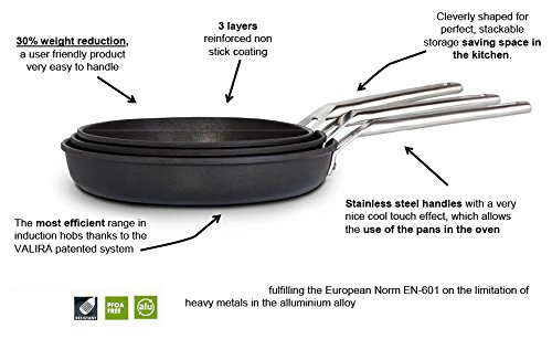 Founded in the early 1970, VALIRA is synonymous of high end, functional and stylish household products. Our location, 100km south of Barcelona by the Mediterranean Sea, defines our soul. Valira prides itself to be the only Spanish company manufacturing Cast Aluminum Cookware. We have mixed innovation and craftmanship to deliver trustful and unique products. Valira is a manufacturer of Specialty Cast Aluminum pans with unique features developed to deliver better and healthier cooking results. Thanks to our technology injecting Cast Aluminum we are able to play with thickness in order to deliver a strong and effective product but very easy to handle thanks to its optimized weight. The same technology enables us to offer specialty items with unique characteristics which maximize the results of all types of cooking. Cast aluminum guarantees a very resistant product which will never warp even under high temperatures. Moreover, it delivers an outstanding heat distribution avoiding dangerous hot spots which can waste your cooking. It is very responsive to changes of temperatures giving you a total control on the cooking. Our products are PFOA free, long lasting, with a non-stick coating and are scratch resistant. They allow a healthier way of cooking by reducing the use of fats and is 100% PFOA free. Our pans are very easy to clean. Our pans feature hollow stainless steel handles with a stay cool effect, and are oven safe. Each of our pans are made in Spain and contain no lead or cadmium. Valira is strongly committed to the health and wellbeing of its customers as well as with the environment. We use 100% recycled aluminum in our manufacturing process ensuring no waste of material and is 100% food contact safe. Valira’s patented system with a 2mm stainless steel disc inserted at the bottom of the pans makes the heat transmission faster and more homogeneous compared to other production technologies. Each pan is cleverly shaped for perfect, stackable storage, saving space in your kitchen. 10-year no-hassle guarantee. Valira is easier, faster and healthier cooking.Feature