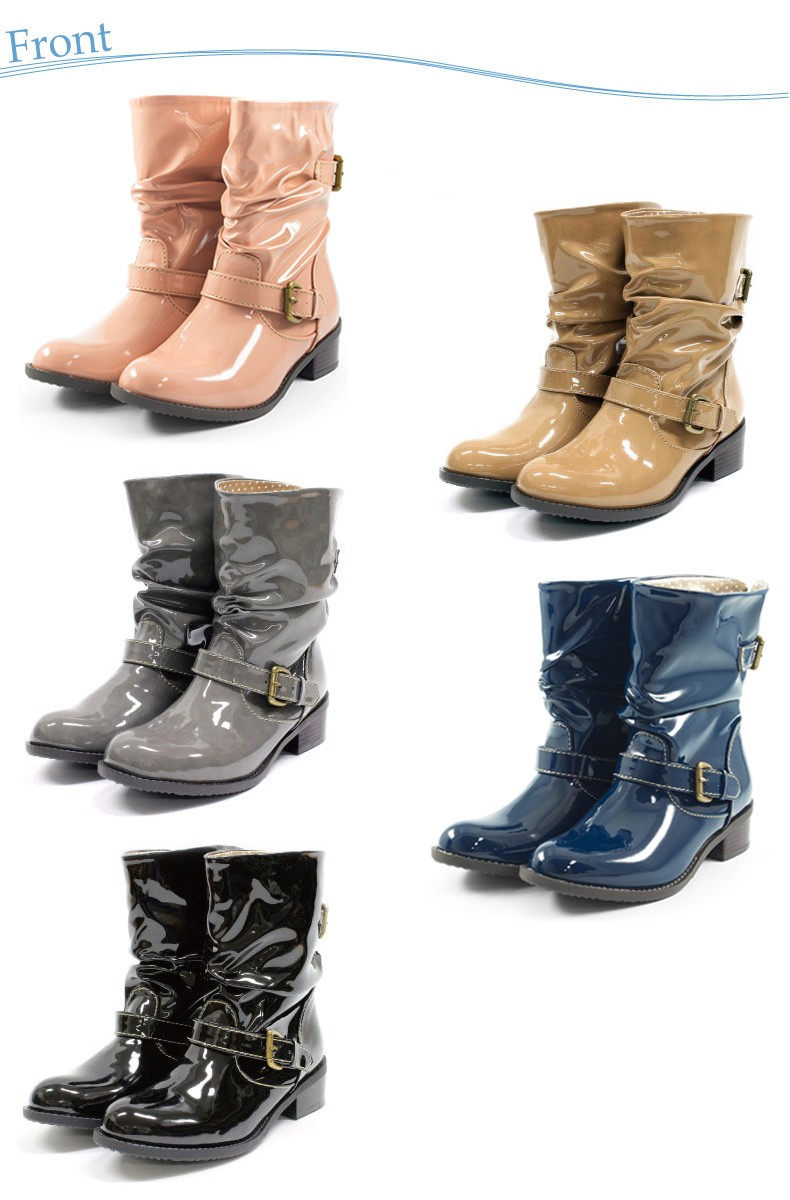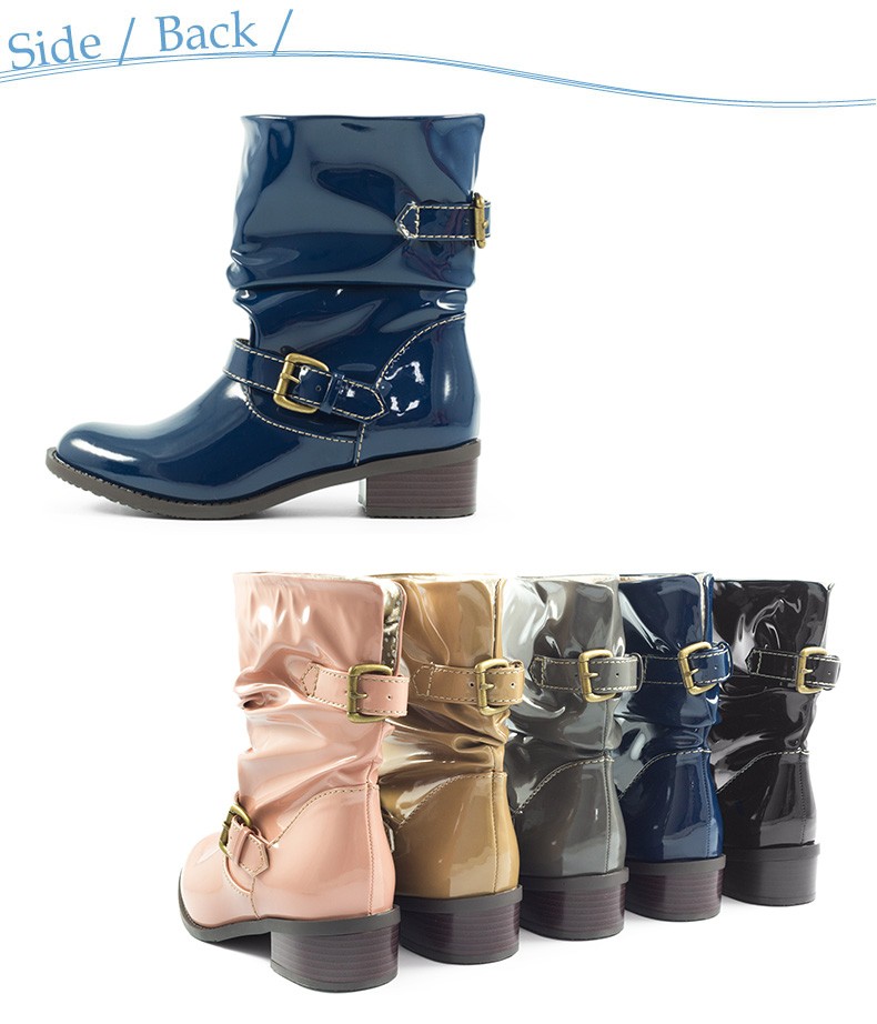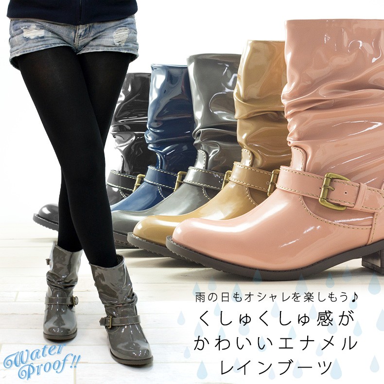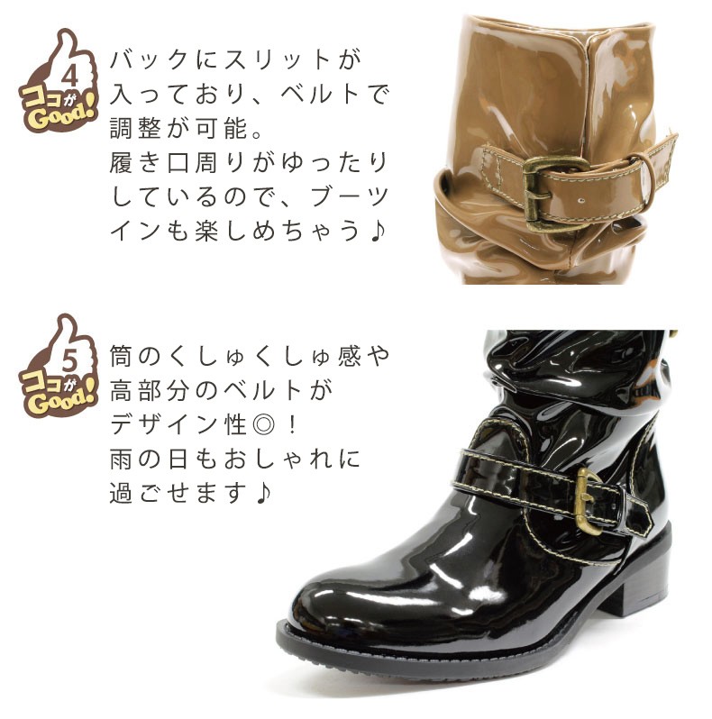 【送料無料 あすつく】エナメルショートブーツ防水機能が付いたレインブーツ♪バックにスリットが入っており、ベルトで調節可能なのでスタイルに合わせて調節出来ます♪履き口周りがゆったりしているのでブーツインも楽しめちゃう♪※足首周りは細めになっています。インソールはうれしい抗菌防臭機能付き☆※撮影は室内で行われており、ライティングにより実物と色味が少し異なる場合がございます。※採寸はスタッフが手作業で行っており、少々の誤差が生じる場合がございます。■足幅…8.0/8.5/9.0/9.5cm■甲幅…13.5/14.0/14.5/15.0cm■ウィズ…D-E程度■ヒール…4.0cm■筒丈…16.0/17.0/18.0/19.0cm■筒まわり…31.0/32.0/33.0/34.0cm■履き口…33.0/34.0/35.0/36.0cm■片足重量…約380-440g (S-LL)■素材…エナメル(合成皮革)■生産国…中国■商品コード…0136389