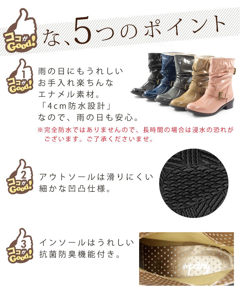 | ポイント | 【送料無料 あすつく】 エナメルショートブーツ防水機能が 付いたレインブーツ♪ バックにスリットが入っており、ベルトで 調節可能なのでスタイルに合わせて調節出来ます♪ 履き口周りがゆったりしているので ブーツインも楽しめちゃう♪ ※足首周りは細めになっています。 インソールはうれしい抗菌防臭機能付き☆ ※撮影は室内で行われており、ライティングにより実物と色味が少し異なる場合がございます。 ※採寸はスタッフが手作業で行っており、少々の誤差が生じる場合がございます。 | |||