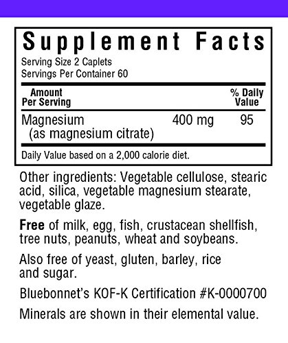 Bluebonnet's Magnesium Citrate is used as a laxative to treat occasional constipation. Magnesium is a naturally occuring mineral that is important for many systems in the body, especially the muscles and nerves. Magnesium citrate also increases water in the intestines. Bluebonnet's Magnesium Citrate provides 400mg of magnesium from chelated magnesium citrate in tow easy-to-swallow caplets for maximum assimilation and absorption.Feature