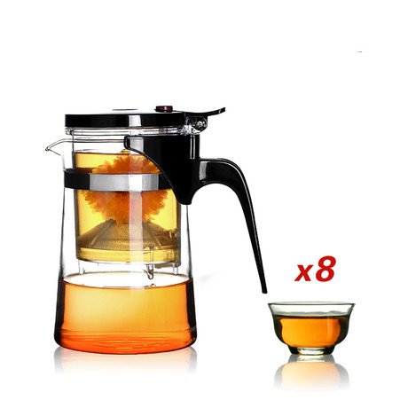 -. Feature : This 16oz (2 cups) tea maker can be used for hot, iced tea, coffee (bag coffee) brew; Elegant and modern design. / Comes with 3 pieces -- glass teapot body, inner cup (made of food grade polycarbonate), and strainer. BPA free. / Allows you to remove the filter and inner cup for cleaning and easily reassemble. / Package includes 8 small glass tea cups.
