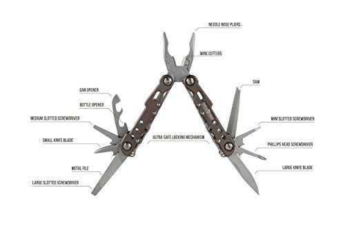 13 FEATURES IN ONE AMAZING TOOL - Needle nose spring-loaded pliers, wire cutters, can opener, bottle opener, medium slotted screwdriver, small knife blade, metal file, large slotted screw driver, ultra-safe locking mechanism, a saw, mini slotted screwdriver, Philips head screwdriver, and a large knife blade