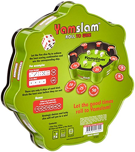 Studio : Blue Orange Publisher : Blue Orange Binding : Toy Product Description Let the five dice roll you to a win with Yam slam! Calculated chances and strategic choices will place the odds in your favor. After each roll, choose the dice that will get you the best combination. Each combination is worth a different point value and has only 4 chips, so get the best ones before they run out. Race your friends to the special bonuses and keep the suspense rolling until the end with Yam slam. Self contained, and made from recyclable tin, Yam slam is travel-friendly and highly durable for years of fun. With its attractive design, bright colors and brilliant play appeal, Yam slam is sure to become the family favorite! 0