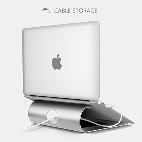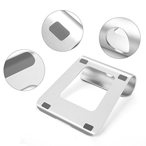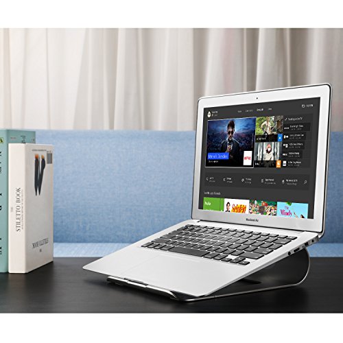 -. Feature : Aluminum laptop stand fits well with most popular laptops, notebooks under 17"; Perfect for your MacBook Air, MacBook Pro and More / Rubber pads and anti-slip silicone feet protect your device from daily scratches and sliding. Sturdy enough to avoid your device tipping over / The ergonomic tilt design gives you a great height for viewing and incline for comfortable typing, relieving your neck fatigue / The design leaves enough room underneath the unit for better air flow, which is also great for extra cable storage / Nice Pedestal for Stand-Up Use in a Kitchen counter for recipes; And the perfect choice to raise the laptop while sitting at a desk or lying in bed, couch, etc.