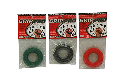 Studio : GripPro Trainer Publisher : GripPro Trainer Binding : Sports Product Description Grip Pro trainer is an extremely effective finger-hand-forearm strength and endurance trainer. It comes in 3 different levels of difficulty: Green-30lb max resistance (easier)-for lighter weight people and warming up, Black-40lb max resistance (medium) for average weight men to train with and Red 50lb max resistance (difficult) for big guys or lower rep strength training. Can be used anywhere and anytime. Try 3 sets of 30-100 reps a couple times a week for best results over time. Its also great for stress relief. This is a set of three grips that comes with one of each size: 30 lb, 40 lb, and 50 lb. 0