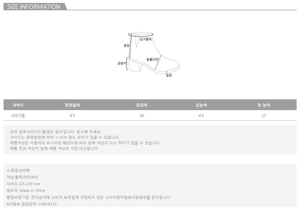 컬러는 블랙,아이보리 2color 구성되어 있으며, 사이즈는 225-250 사이즈로 진행되오니 고객님의 체형에 맞게 선택하셔서 예쁘게 착용하시길 바랍니다.