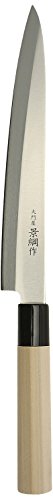Sword making history in Japan dates back over 1,000 years, when master swordsmiths practiced their craft making weapons for warriors. Modern Japanese kitchen knives are a descendant of these renowned swords, as evidenced in the details, ideals, and spirit that have been passed down through generations that go into each tool. This particular knife has a yanagi shape. It is beveled and sharpened on one side of the blade only and is long and narrow, to ensure a slice in one smooth motion that will not damage or tear the flesh of fish or meat. Stainless steel, designed for left-handed users.