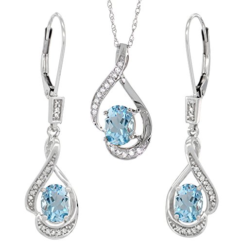 -. Title : 14K White Gold Natural Aquamarine Lever Back Earrings & Pendant Set Diamond Accent