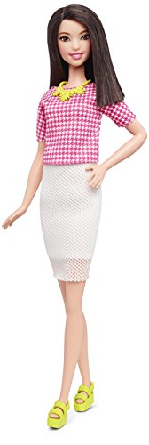 Each Barbie Fashionistas doll includes a pink and white houndstooth top paired with a white mesh pencil skirt.