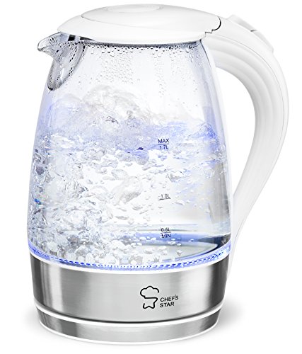 Chef's Star Brosilicate Glass Kettle rapidly boils up to 1.7 liters of water. This sleek electric kettle boils water faster than the stove or microwave. Filling and cleaning this kettle is super easy. By lifting the kettle from the corded base, you can easily fill the kettle with water. The clear glass with its water-level indicator lets you view the exact water level. The modern soft blue LED illumination in the glass kettle signals when the kettle is boiling and conveniently shuts off once the water is boiled so the kettle never boils dry or overheats. Fine mesh built-in filter strains water so you get a smooth cup of coffee and tea. This Chef's Star Brosilicate Glass Kettle is made from the finest durable brosilicate glass from quality craftsmanship. It is compact, space-saving and looks great on any kitchen counter.