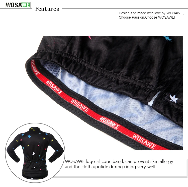 Silicone Hem: WOSAWE logo silicone band, can prevent skin allergy and the cloth up slide during riding very well.