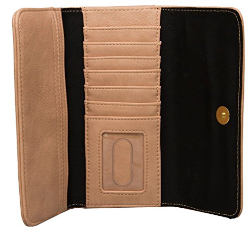 Front snap closure, Clear I.D slot, 6 credit card slots, bill slots and a zipper pocket on the back.