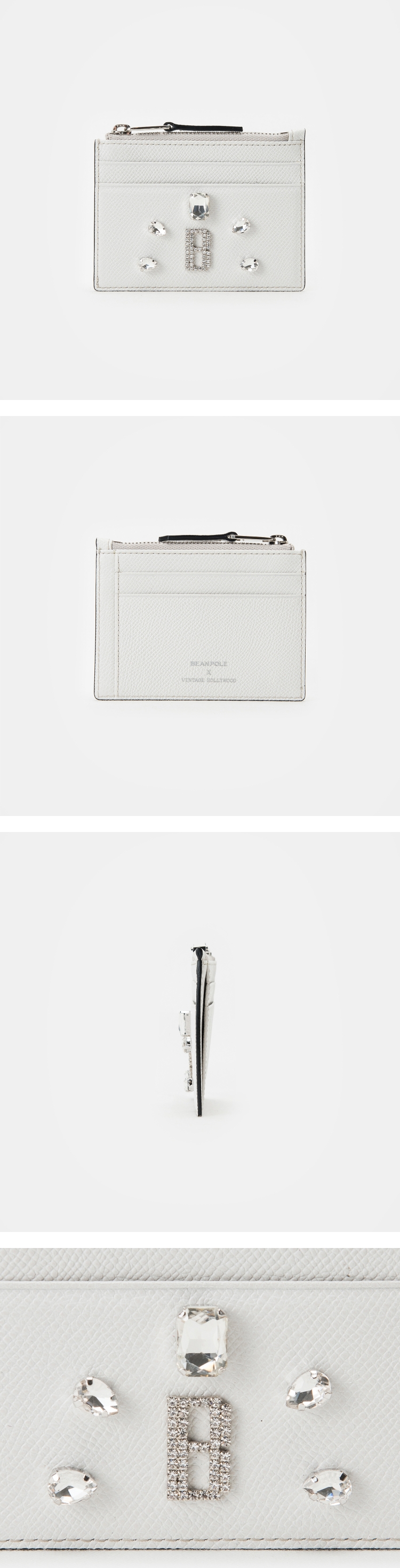 빈폴액세서리의 빈티지 헐리우드 콜라보 카드지갑입니다.국내 1세대 커스텀 쥬얼리 브랜드 빈티지 헐리우드와의 콜라보 라인으로 기존에 시도하지 않았던 장식을 활용한 카드지갑입니다.페미닌하며 블링블링한 무드로 구성된 아이템입니다.리프레시 할 수 있도록 제안하는 포인트 제품입니다.사이즈: 10.6*7.5cm(42.5g).제품설명 - 카드칸 4 / 오픈칸 1 / 지퍼칸 1.