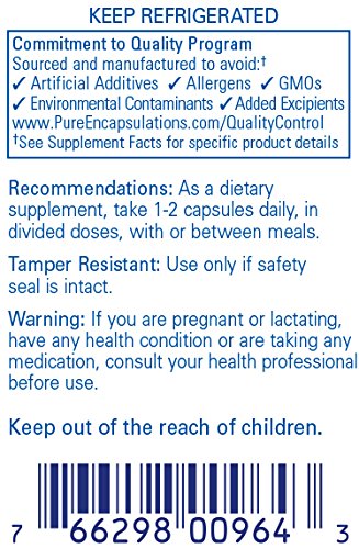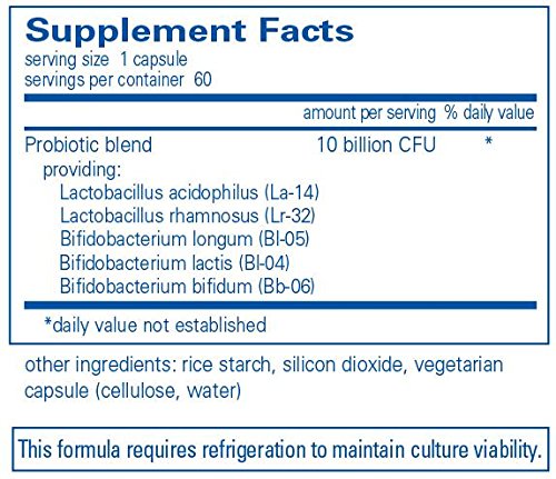 -. Feature : Combines lactobacilli and bifidobacteria to promote gastrointestinal (GI) tract health and comfort, immune cell function and overall health.* Strains are grown on a dairy-free & soy-free medium. / REFRIGERATE: This formula requires refrigeration to maintain culture viability. / 60 Count / Pure Encapsulations recommends 1-2 capsules daily, in divided doses, with or between meals. / At Pure Encapsulations, our products are free from: wheat and gluten; egg; peanuts; coatings and shellacs; GMOs; magnesium stearate; trans fats and hydrogenated oils; artificial colors, flavors and sweeteners; unnecessary binders, fillers and preservatives. Any product containing ingredients derived from allergens, such as soy, dairy or shellfish, is clearly labeled.