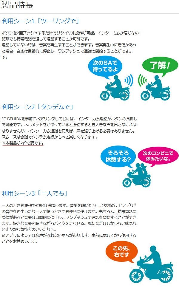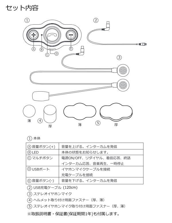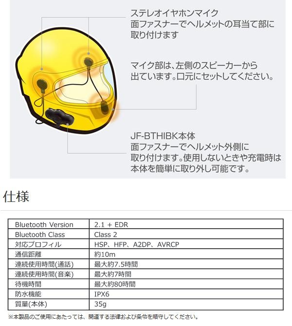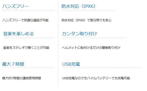 バイクのヘルメットに取り付け、乗車中でも通話や音楽を手軽に聞くことができます。面ファスナーなので、取り付けも取り外しも簡単。充電はUSBで行う事ができますので、モバイルバッテリーなどでも充電が可能です。 |