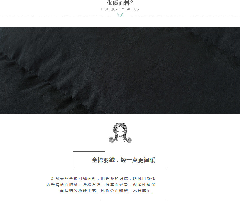 100%棉 帽里:100%棉 里料:100%聚酯纤维 填充物:白鸭绒 含绒量:80% 充绒量:126g(XS)134.6g(S)143.2g(M)151.8g(L)160.4g(XL)169g(XXL)