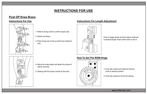 -. Binding : Health and Beauty -. Brand : Orthomen -. EAN : 0686603093672 -. Feature : Post-operative immobilization; Rang of motion control for stabilization / Status post collateral and/or cruciate ligaments OP / Tool-free length-adjustable collateral bars prevent valgus and varus deformity / Newly designed telescoping adjustable ROM hinges with super wide range setting / Simply rotate and press lock setting; Easily apply on and take off by side buckles -. IsAdultProduct : 0 -. Label : Orthomen -. Manufacturer : Orthomen -. ProductGroup : Health and Beauty -. ProductTypeName : HEALTH_PERSONAL_CARE -. Publisher : Orthomen -. Studio : Orthomen -. Title : Orthomen Post Op Knee Brace, Hinged ROM Knee Brace, Adjustable Medical Orthopedic Support Stabilizer, Universal Standard -. UPC : 686603093672