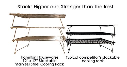 Stack Your Racks! The Most Versatile Cooling Rack on the Market - Much tighter wire spacing than competing stackable racks - Only stackable rack that fits into a standard half sheet pan - Thick wires ensure stability when stacked A Stackable Rack Without Compromise If you're looking for a stackable cooling rack, you might be frustrated by their limitations. Some aren't oven safe. Others don't fit into standard baking pans. And many have large spaces between their wires, letting food fall through. The Hamilton Housewares 12" x 17" Stackable Stainless Steel Cooling rack is the answer. We designed it with these drawbacks in mind and delivered an exceptional solution. It is oven safe to 575 degrees, fits half sheet baking pans when folded, and has a wire grid tight enough for small foods like French fries. Furthermore, we've increased the standing height to accommodate your largest baked goods. Like our other racks, we use nothing but Grade 304 stainless steel for maximum durability and rust resistance. Your search is over. Our Racks Have What Others Lack - All Grade 304 stainless steel construction - Thick, commercial grade wires - Tightly-spaced wire grid - Oven and dishwasher safe Lifetime Replacement Guarantee We're confident our racks are the most durable on the market. If your rack fails at any time, return it for a full replacement or refund. Click Add to Cart at the Top Right to Order Your Rack Now! 0 |