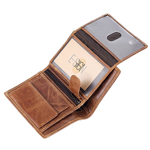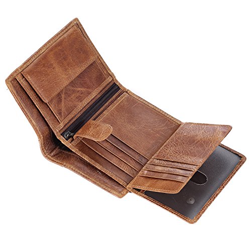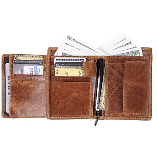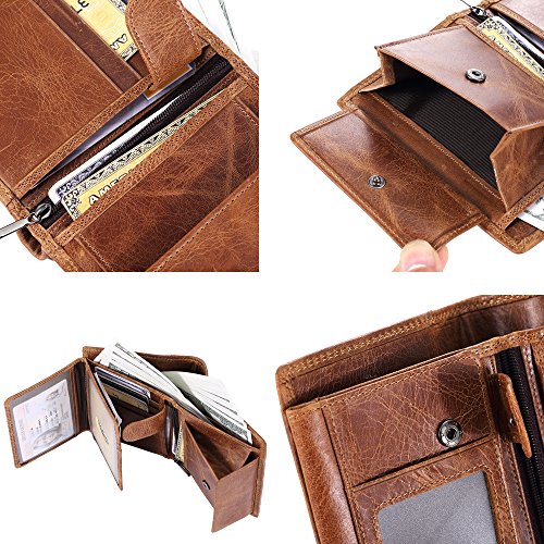 -. Feature : GENUINE LEATHER: 100% genuine leather, soft, breathable comfortable. The lining was made of polyester, smooth and durable. / Functional Capacity: 3 display window, 8 card slots and 2 slip-in pockets,1 stud pocket. 1 coin pockets with zippers, and 2 full-length compartments for cash. / ENHANCES PERSONAL SECURITY: We leverage top RFID technology to block RFID signals used to electronically scan your wallet as someone passes by unnoticed. This keeps your vital information in driver license, debit cards and credit cards from being stolen. / Dimensions: folded (Lx W x H: 5.1" x 3.7" x 0.9'') unfolded (L*W: 7.5'' x 5.1'' x 0.3''). The size well fits in your back pocket much more comfortably, but the front packet is also fitting. / Great item for yourself or as a gift for friends and family on Birthday, Anniversary, Thanksgiving, Christmas, and all other holidays!