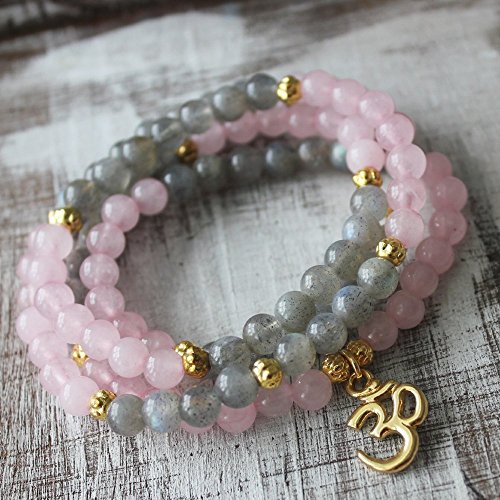 -. Title : 108 Rose Quartz Labradorite Gold OM Mala Wrapped Bracelet