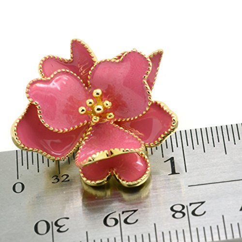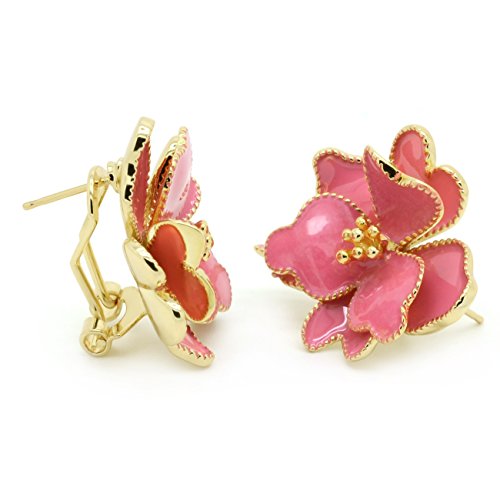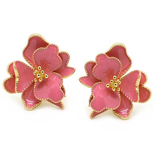 Say "I Love You" with these lovely flower earrings! Made of brass metal, these exquisite earrings are featuring a blossoming wild rose flower with its individual petals accented with soft pink enamel. The intricate detailings of each petal are beautiful and portray a blossoming flower coming to life in 3D. Gold plated finishes the look for a more luxurious touch. Omega backings secured these earrings easily and comfortably. Flower is a universal symbol of love and affectionate, there is nothing clearer than this to convey your feelings to the important ladies in your life, such as wife girlfriend, lover, bestfriend, mother, sister, grandma, daughter or bridesmaids. These fashion jewelry earrings will be an excellent gift for Mother's day, Anniversary, Birthday, Graduation, Wedding, Valentine's day or Christmas presents!Feature