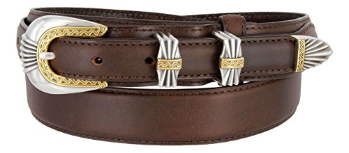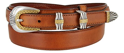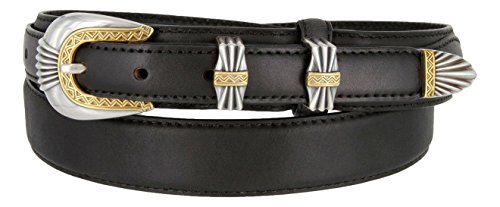 Binding : Apparel Product Description The Silver and Gold Buckle Set Oil-Tanned Genuine Leather Western Ranger Belt for Men is a classic and sleek Texas ranger style oil-tanned genuine leather ranger belt. Matching 4-piece Silver and gold-finish western style buckle set. This is a 1-1/8" (30mm) wide tapers down with billets at 3/4" for the buckle and tip ends. This belt is measured from the fold to the center hole. Measure where you wear the belt in order get the best size. 0