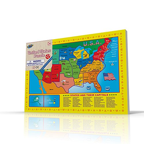 -. Feature : 17 PIECE WOODEN USA MAP PUZZLE SET: This 17 piece map puzzle is a creative toy/game for any toddler that can keep her engaged for many hours by challenging her. The package includes a base/board and 17 puzzle pieces in the form of all states in the USA that the baby needs to fit in the right slots in the board. / EDUCATIONAL LEARNING AND SKILL DEVELOPMENT: The united states map puzzle not only helps your baby learn the states and keep her entertained for hours but also a provides a means of overall development - it helps in the development of cognitive ability, motoring skills and problem-solving skills of the baby, and can even be used to teach color. / ENTERTAINMENT UNLIMITED: The state pieces can be either arranged in the slots cut into the board, or can be used for counting too! Moreover, your baby can even learn to pronounce each state while dumping it down. The strong visual impressions formed by the states make the learning process a lot easier and is great for developing important brain functions. / SAFE AND COMFORTABLE: The puzzle is made up of non-toxic and non-allergic materials, and sized such that they comfortably fit in the hands of toddlers and kids. The puzzles are ideal for children with 3+ years of age and help create precious childhood memories. Makes a great classroom toy when learning about the American country and its geographic history! / 100% RISK-FREE SATISFACTION GUARANTEE: We also offer you 100% risk-free satisfaction guarantee to let you buy with confidence; no questions asked. However, we are quite sure that your baby will love playing with this map puzzle and her achievements will bring smile on even your face.