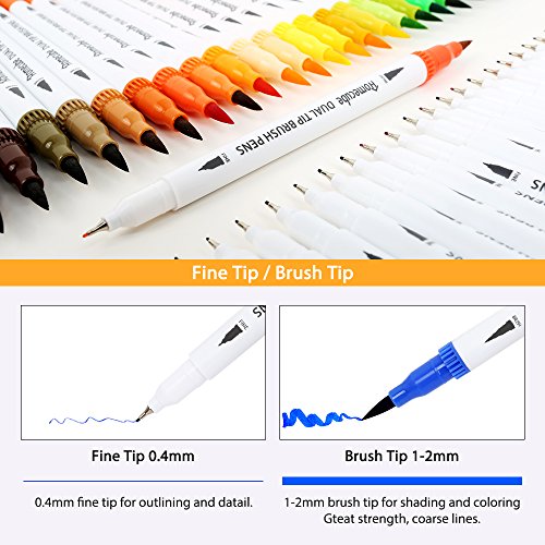 - √ Dual Tip Art Pen: double tips for flexible use, one tip(0.4mm) for painting or writing, and another(1-2mm brush) for coloring. Very convenient when painting, or taking notes...