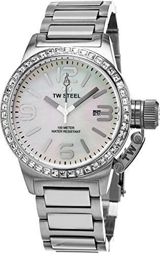 Brushed stainless steel case (40 mm in diameter, 13 mm thick), Stainless steel screw-down case-back with embossed TW Steel logo, Bezel set with 46 Swarovski crystals, Mother-of-pearl dial with TW Steel logo at the 12 o'clock position, Silvered hands, indices and Arabic numerals, Date window at the 3 o'clock position, Reinforced mineral crystal, Screw-down crown cap, Quartz movement, Miyota caliber 2115, Water resistant to 10 ATM/100 meters/330 feet, Brushed and polished stainless steel bracelet, Push button deployment clasp with safety, Model number: TW302.