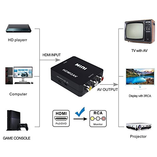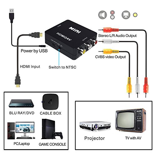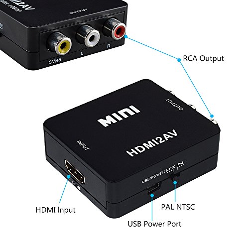 Studio : Alitutumao Publisher : Alitutumao Binding : Electronics Product Description LiLiLan Mini HDMI to RCA/AV Converter Adapter The Mini HDMI to RCA/AV Converter converts HDMI video/audio signal to AV(CVBS) composite video signal and the FL/FR stereo audio signals, supporting DVI system sideline signals. It helps users to convert high quality of HDMI video signal into normal CVBS signal(standard-definition 480i,576i), used on devices such as TV, VHS VCR, DVD recorders,etc, supporting two formats of NTSC and PAL.