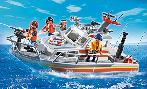 Set includes three figures, boat, fire hoses, rescue ring, first aid kit, and other accessories