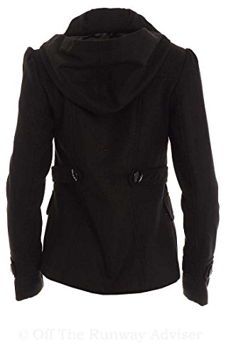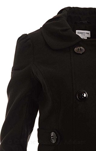 This coat by Celebrity Pink features lightweight material, removable hood, double breasted button front closure, long sleeves, on-seam pockets with faux flap closures, classic pea coat silhouette, full lining.Feature