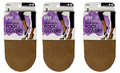 -. Binding : Apparel -. Brand : L'eggs -. Department : womens -. Feature : Includes 3 packs of 2 pairs for a total of 6 Pairs / Black & Natural are 91% Nylon, 9% Spandex / White is 43% Cotton, 43% Nylon, 14% Spandex / Each pair features a cushioned massaging pad that feels great! / Ulta-low, no show foot covers. -. ProductGroup : Apparel -. ProductTypeName : SOCKSHOSIERY -. Title : 6-Pairs (3-Packs) L'eggs Cushioned Massaging Foot Covers