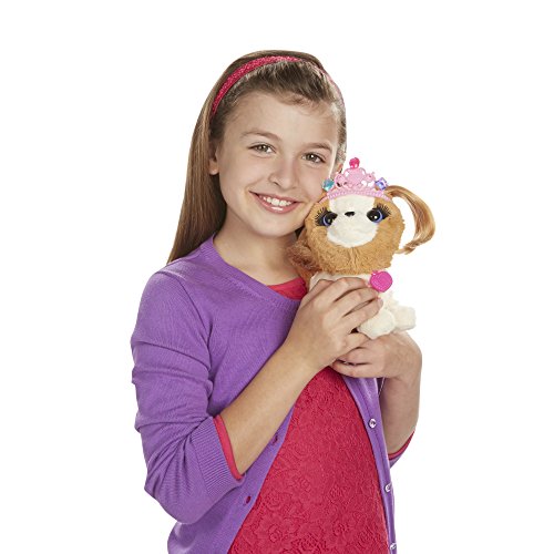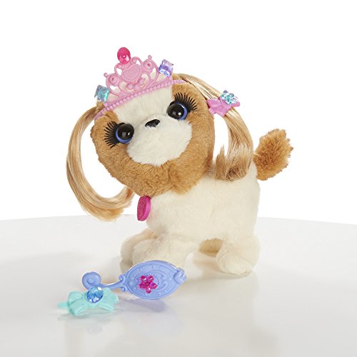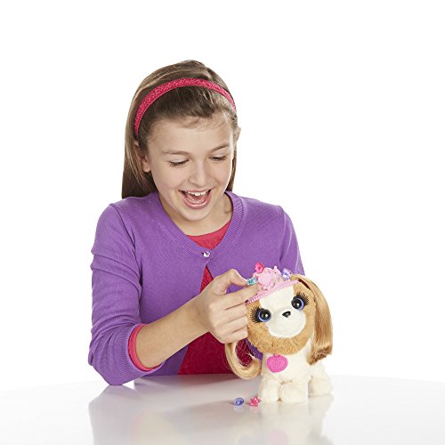 Win best in show when you groom your Princess Pup pet to perfection! This soft puppy figure's hair is soft and ready for styling, and she comes with a brush and 2 barrettes so you can make her look spiffy. You can give her one of 2 hairstyles, and then it's time to dress her up in her dress. Give her a pupicure with the nail decals! Then you can use the wand to color her dress up even more, and accessorize her look with the tiara and plug-in jewels. Best of all, her collar is a bracelet you can wear! You and your Princess Pup pet will both look gorgeous when you go out together! FurReal Friends and all related characters are trademarks of Hasbro.Feature